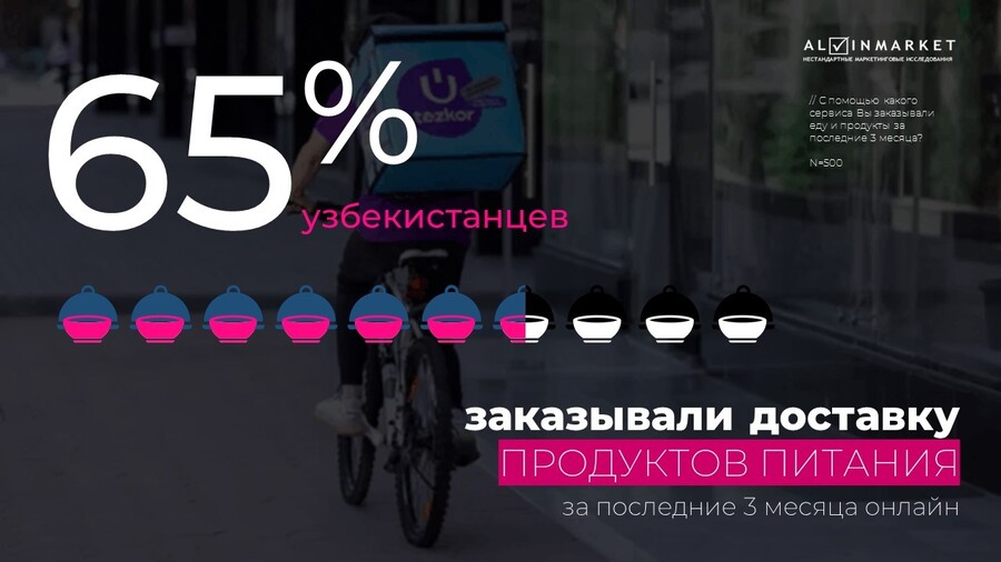 Ещё один важный инсайт: онлайн-доставка еды и продуктов уже стала частью повседневной практики для многих жителей Узбекистана. За последние три месяца 65% опрошенных заказывали продукты питания через интернет.
