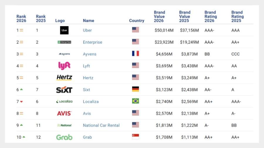 Первое место этого рейтинга занимает с громадным отрывом от всех остальных участников Uber. Этот американский бренд получил оценку $50 млрд. У занявшего вторую строчку еще одного американского бренда Enterprise оценка вдвое меньше – $23,9 млрд. На третьем месте французский Ayvens – $4,7 млрд.