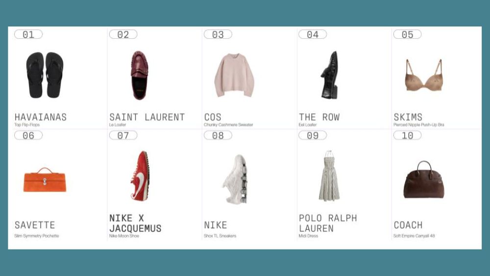 Самыми популярными товарами сезона стали: шлепанцы Havaianas Top Flip-Flop, кожаные лоферы Saint Laurent, сумка COS Sculpted Leather Bag, свитер The Row Ophelia, сумка Coach Tabby, платье Miu Miu Sheer Slip Dress, очки Prada Symbole, и аромат Bottega Veneta Mezzanotte.