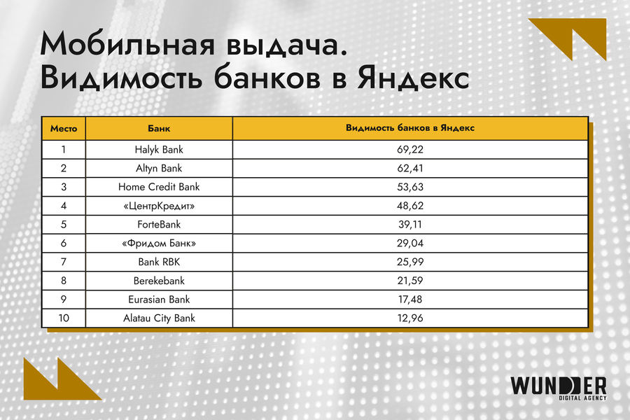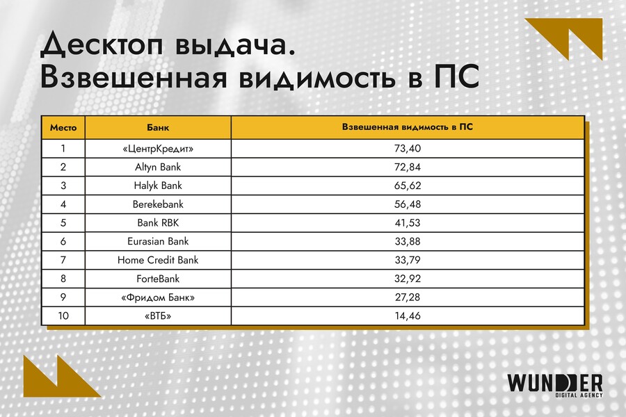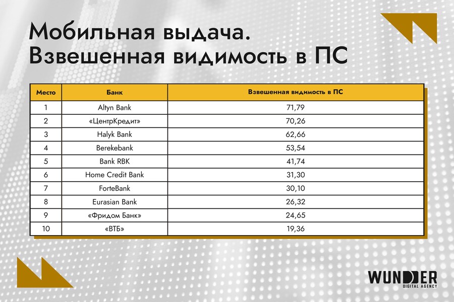 - Altyn Bank совершил рывок с четвертого места на первое, увеличив видимость на 12 п.п. Банк грамотно использовал мобильную оптимизацию и укрепил позиции.