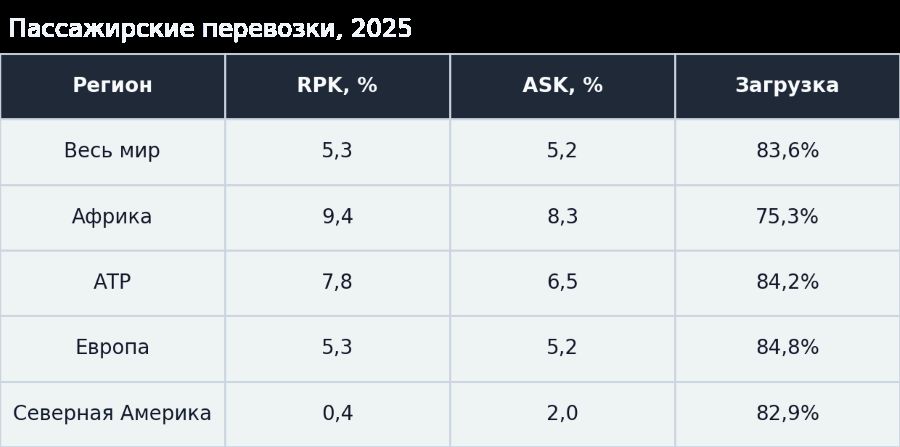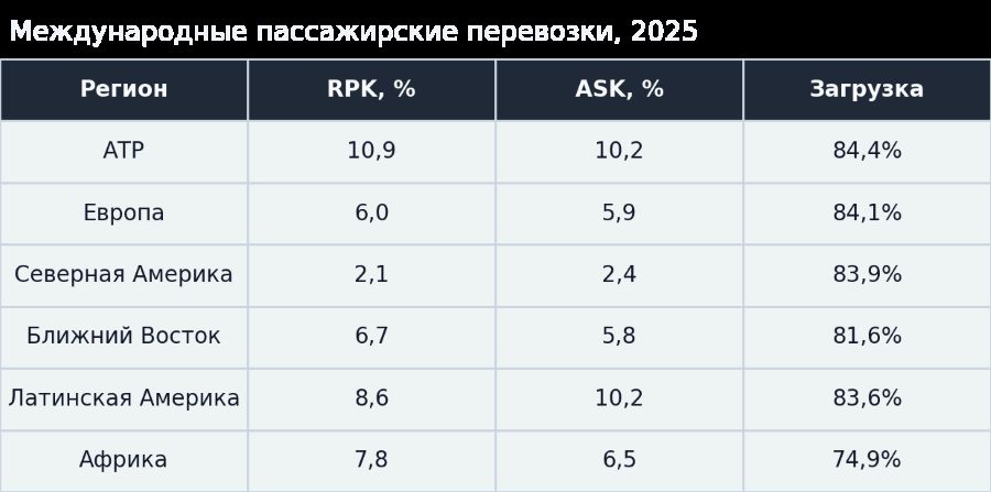 Азиатско-Тихоокеанский регион завершил 2025 год с максимальными темпами роста и самым высоким уровнем загрузки по сравнению с другими регионами. Северная Америка продемонстрировала самые низкие темпы роста пассажиропотока и провозной емкости среди регионов в 2025 году, при этом самое значительное падение коэффициента загрузки среди регионов продемонстрировала Латинская Америка.