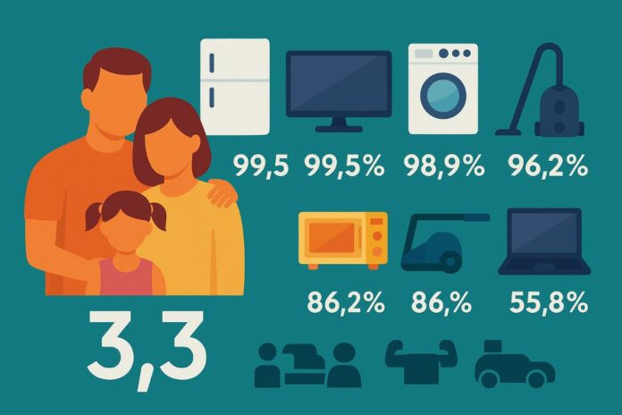 - Холодильники и телевизоры — по 99,5% (обеспеченность холодильниками выросла, а телевизорами — немного снизилась),
