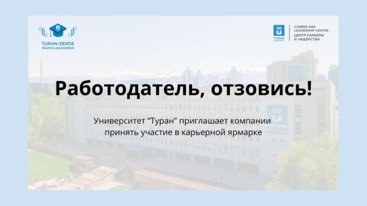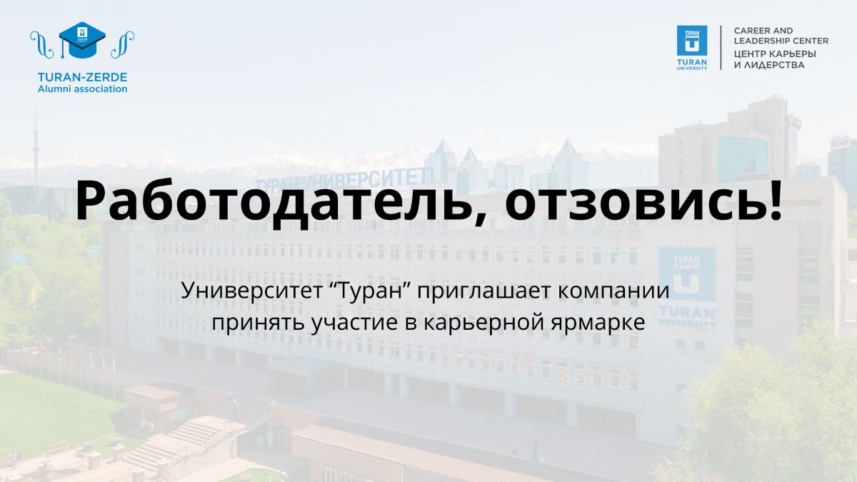 Организатором выступает Центр карьеры и лидерства Университета «Туран» – структурное подразделение вуза, которое на постоянной основе работает с работодателями и сопровождает студентов в вопросах профессионального развития, трудоустройства и карьерного роста.