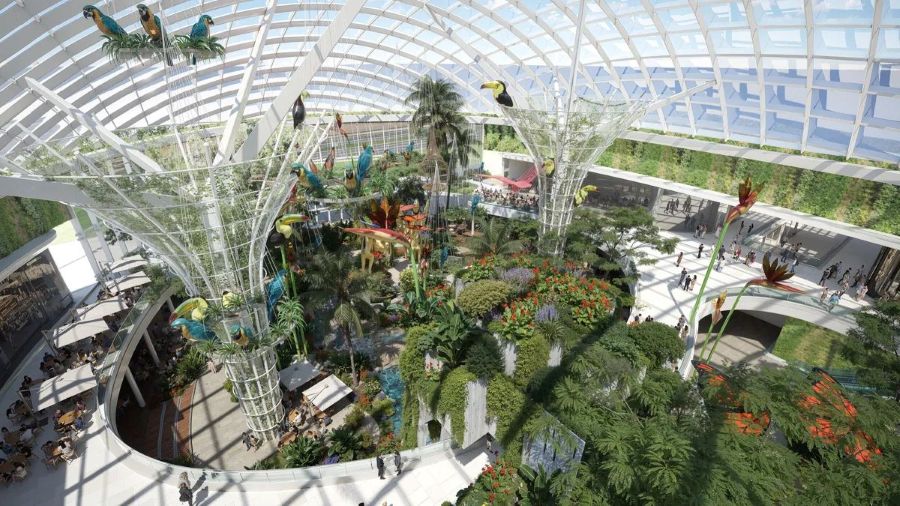 Одной из ключевых особенностей будущего центра станет крытый тропический сад, который разместят в центральной части здания. Его площадь может достигать 10 тыс. кв. м. По замыслу авторов проекта, зеленое пространство станет главным архитектурным элементом комплекса и зоной притяжения для посетителей.